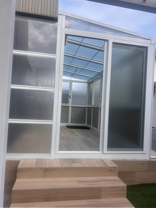今回はそのタイルデッキ上に、三協アルミのテラス囲い「晴れもようwith」を新たに設置しました。